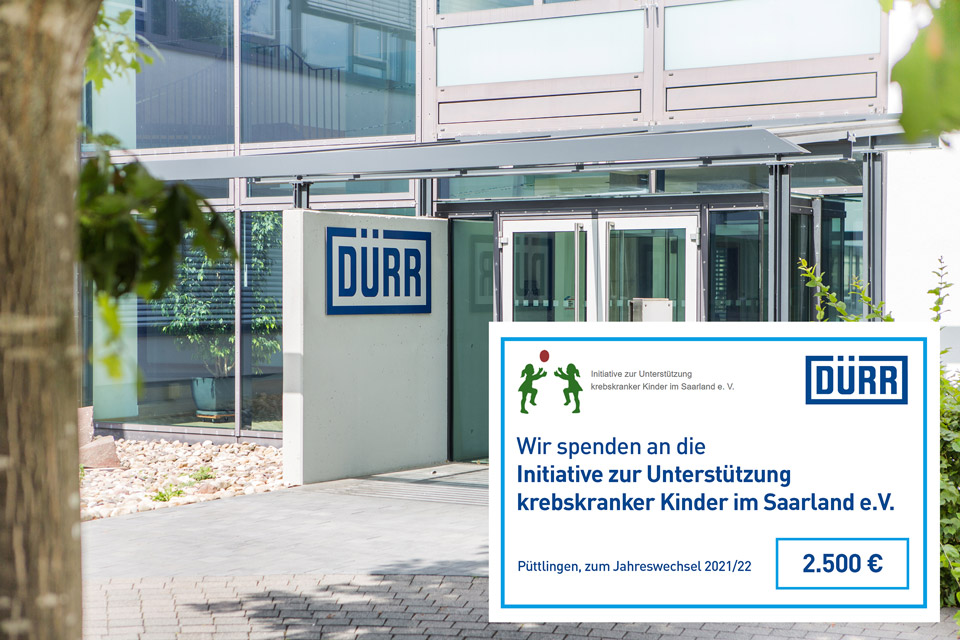 Jährlich spendet die Dürr Assembly Products GmbH an einen gemeinnützigen Verein in der Region. Die Mitarbeiterinnen und Mitarbeiter des Unternehmens haben gemeinsam entschieden, dass die Spendenaktion zu Weihnachten 2021 an die Initiative zu Unterstützung krebskranker Kinder im Saarland e.V. geht. Pandemiebedingt wurde auf eine persönliche Spendenübergabe verzichtet.